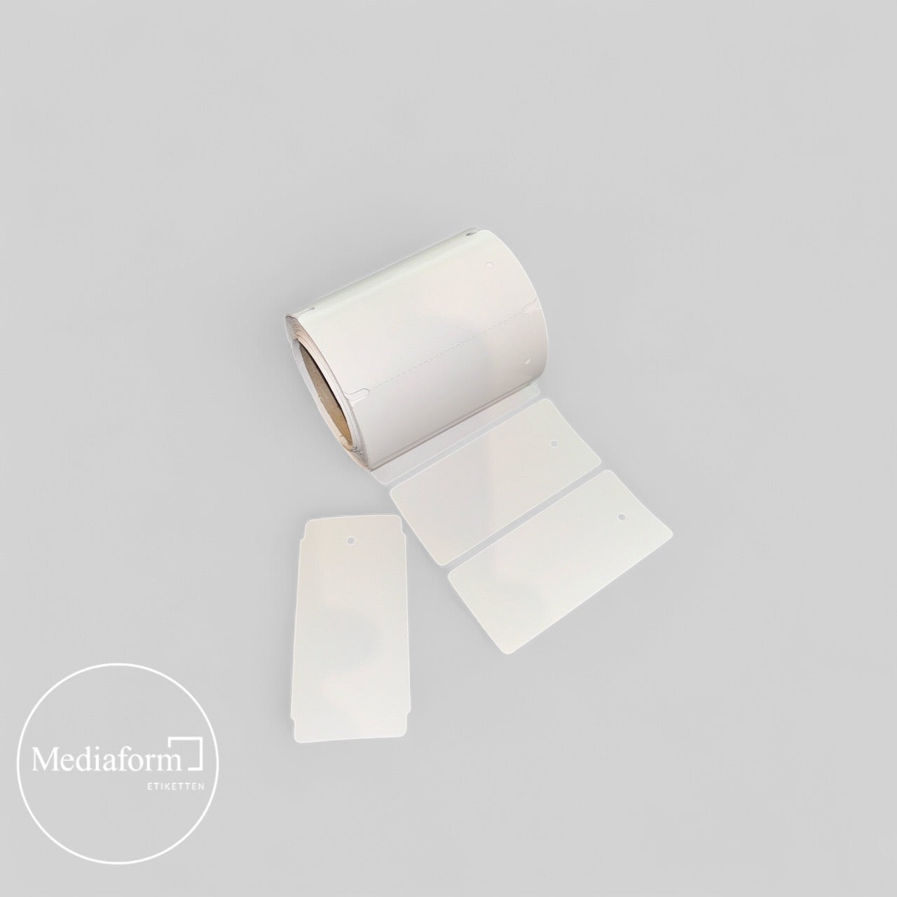 Hängeetiketten 80 x 40 mm glänzend weiß mit Loch und Blackmark